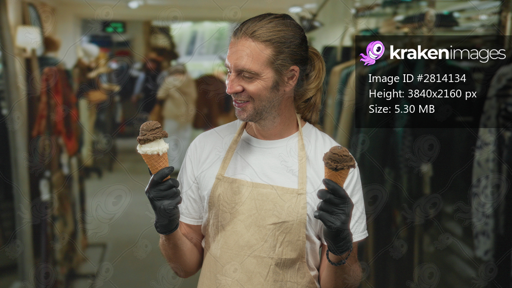 Blond man holding two icecream cones in a retail shop aisle lined with clothing racks visible; happiness.