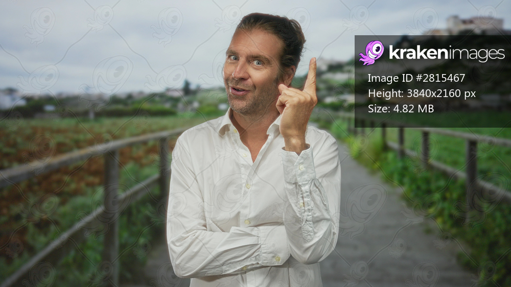 Blond man in a white shirt points finger to head in a forest avenue lined with green foliage; inspired thinking.
