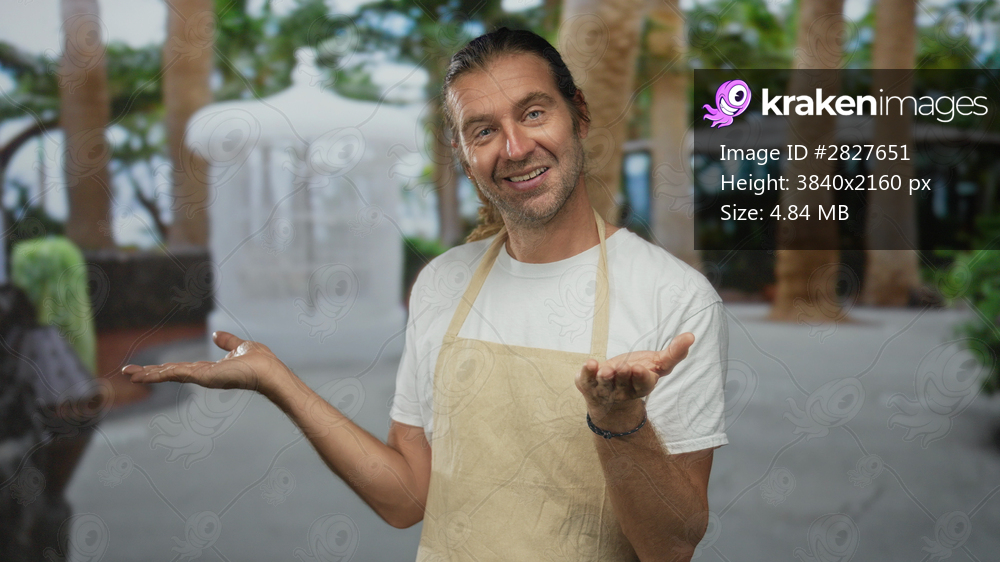 Blond man in apron shows open palms against lush green forest backdrop while smiling warmly; welcome.