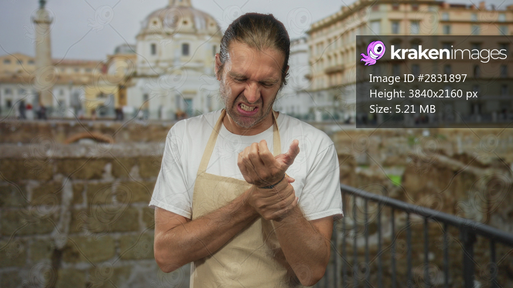 Blond man in canvas apron clutches wrist on narrow street beside weathered building facade with ancient ruins beyond; discomfort.