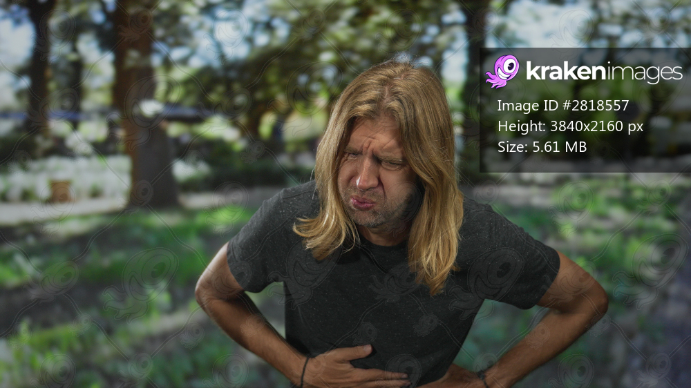 Blond man in dark gray t shirt clutching bare belly among sunlit green trees in forest clearing under dappled sunlight; discomfort.