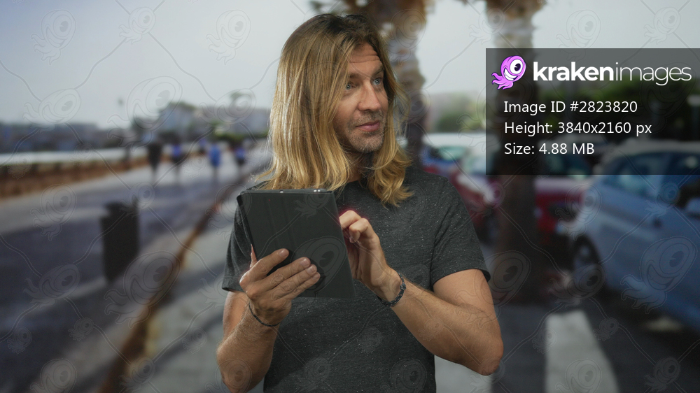 Blond man in gray tshirt swipes tablet touchscreen on sunny street lined with palm trees and parked cars; curiosity exploration.