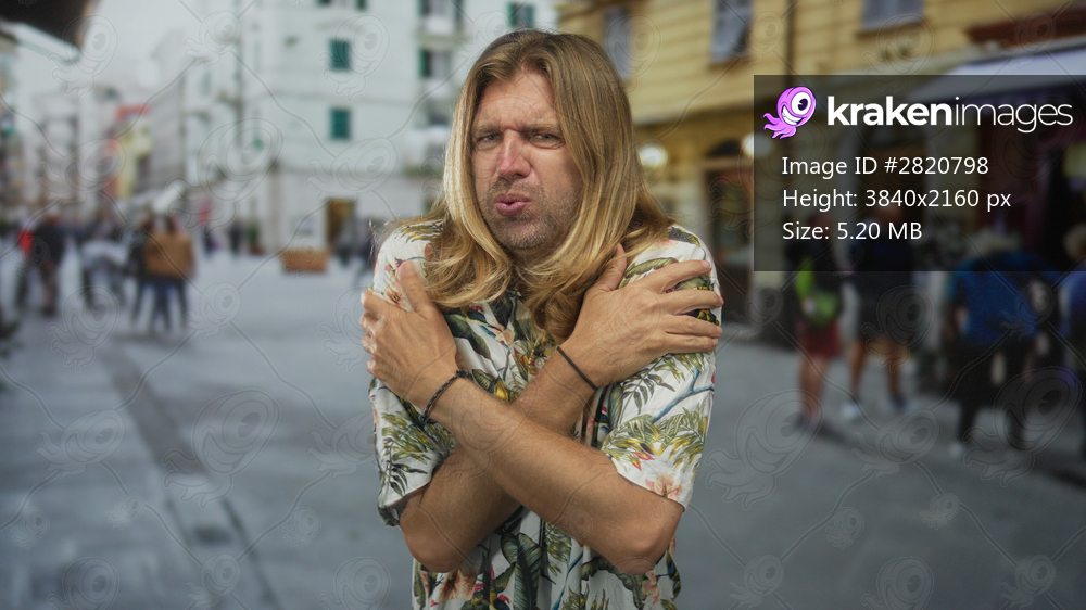 Blond man in tropical shirt crosses arms and shivers on a crowded sunlit street amid passersby; cold discomfort.