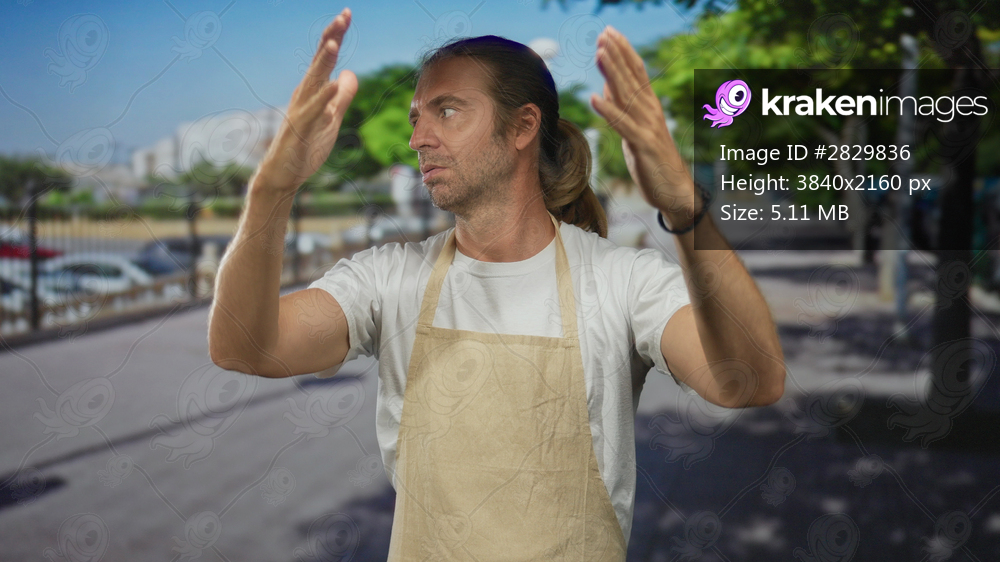 Blond man with long hair and apron raises arms on sunny street; confusion frustration anxiety tension.