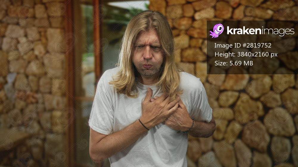 Blond man with long hair clutches chest for heartattack while standing at building entrance door framed by stone wall; heartattack distress vulnerability. - Kraken Images