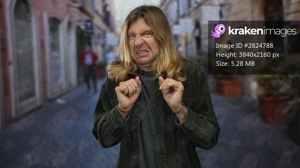 Blond man with long hair cringes with hands raised near chest and narrowed gaze on sunlit narrow cobblestone street; disgust.
