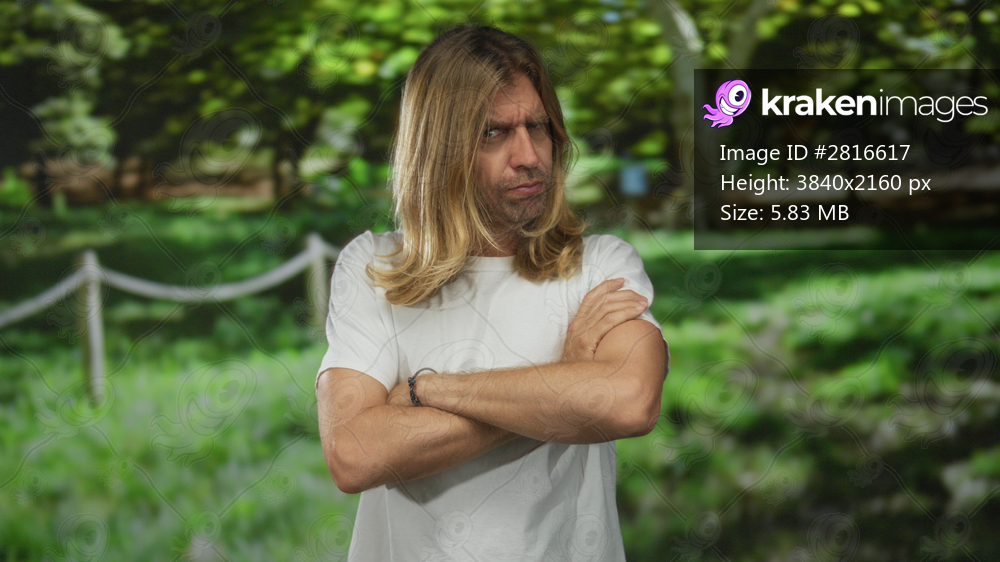Blond man with long hair crosses bare arms in forest wearing white shirt with furrowed brow; skepticism doubt.