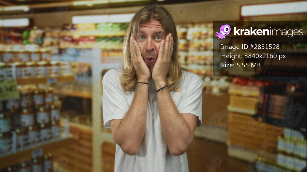 Blond man with long hair holds cheeks with both hands and open mouth amid building aisle stocked with groceries; surprise.