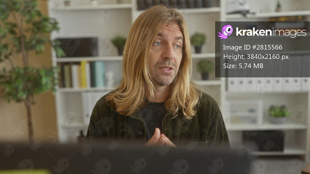 Blond man with long hair holds hands together while speaking in building office lined with binders and plants; concentration.