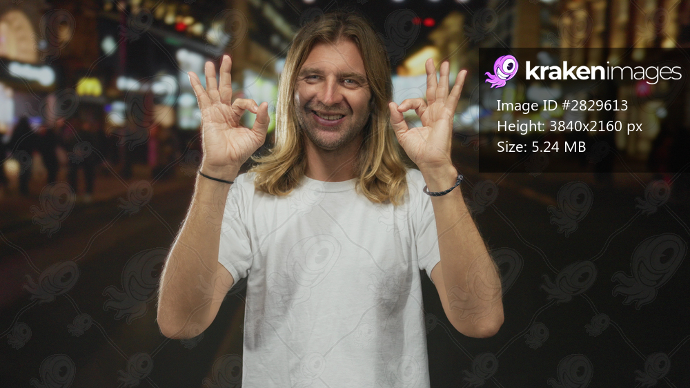 Blond man with long hair makes ok sign gesture with both hands and wide smile on bustling nighttime street; approval.