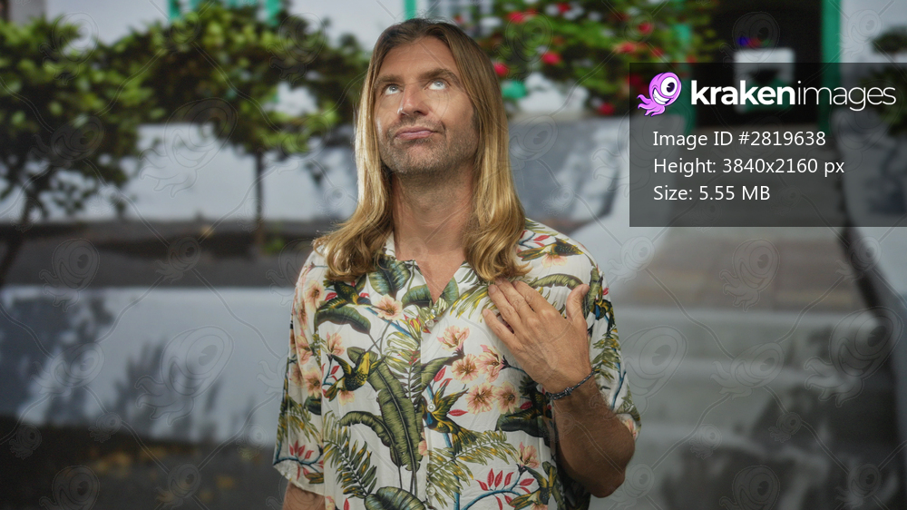Blond man with long hair placing hand on chest and looking upward at stone building entrance; sincerity.
