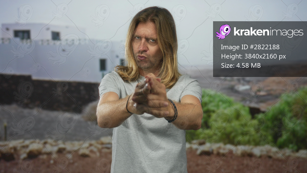 Blond man with long hair pointing finger at door of building entrance in an earnest stance; serenity.