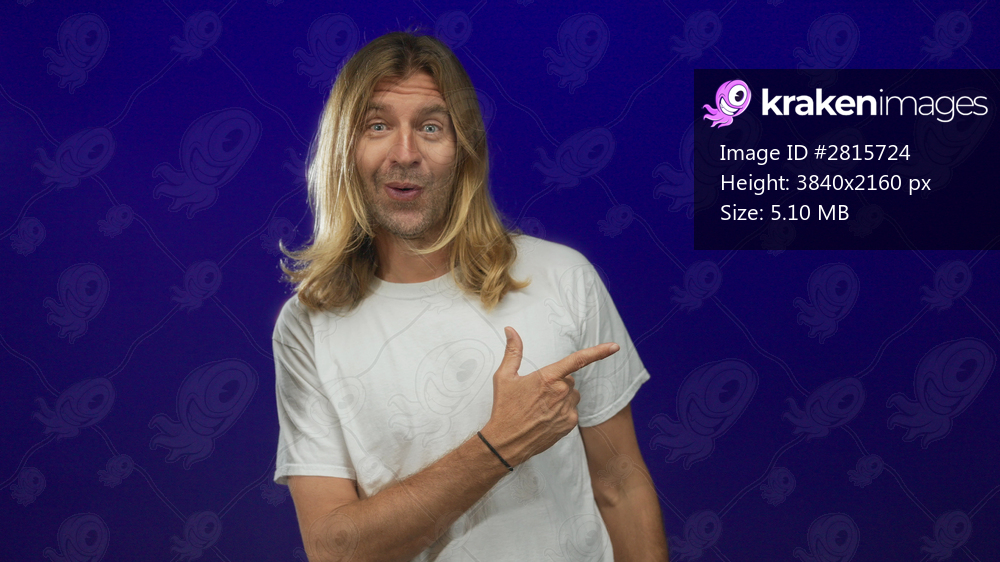 Blond man with long hair pointing finger to right in cobalt blue studio setting as he looks sideways; surprise.