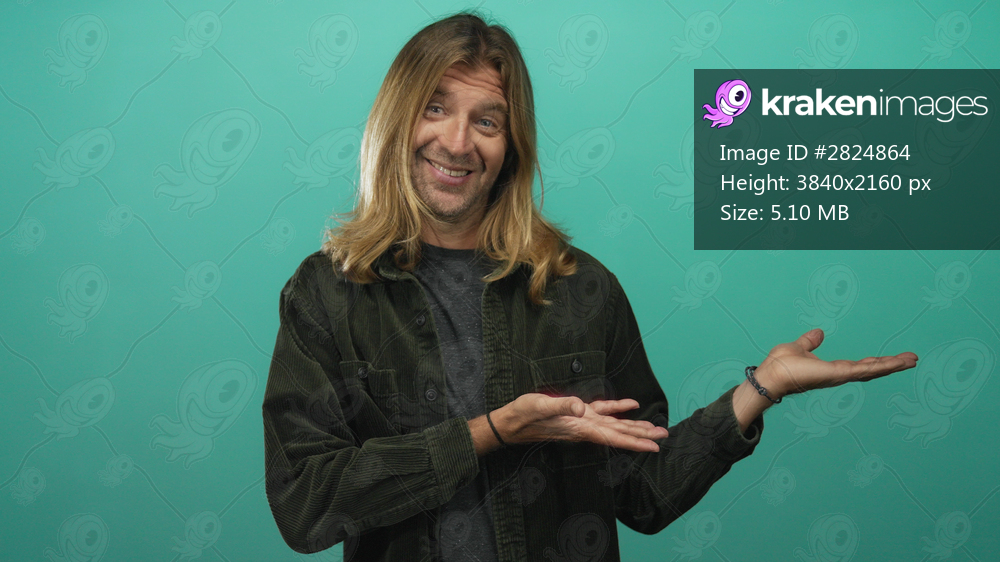 Blond man with long hair presenting open palms in a studio setting with teal walls; invitation curiosity.