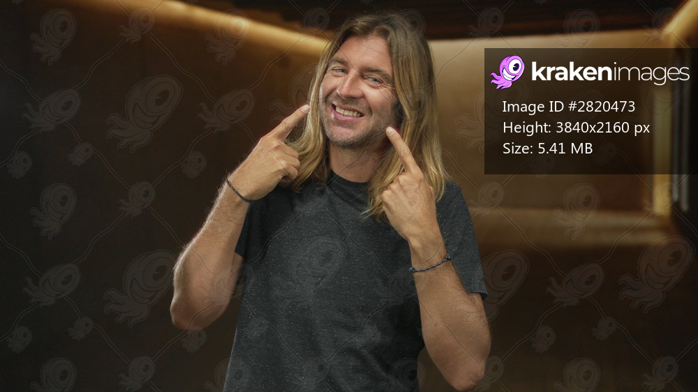 Blond man with long hair and scruffy beard points fingers to wide cheerful grin against dark wall in studio; joy.
