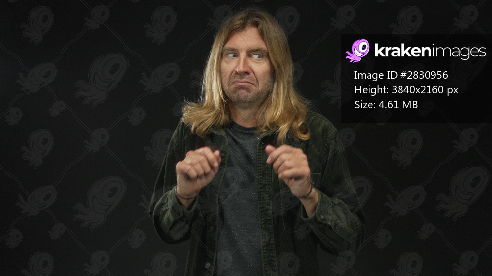 Blond man with long hair scrunches face and pinches fingers near chest in black studio set; disgust.