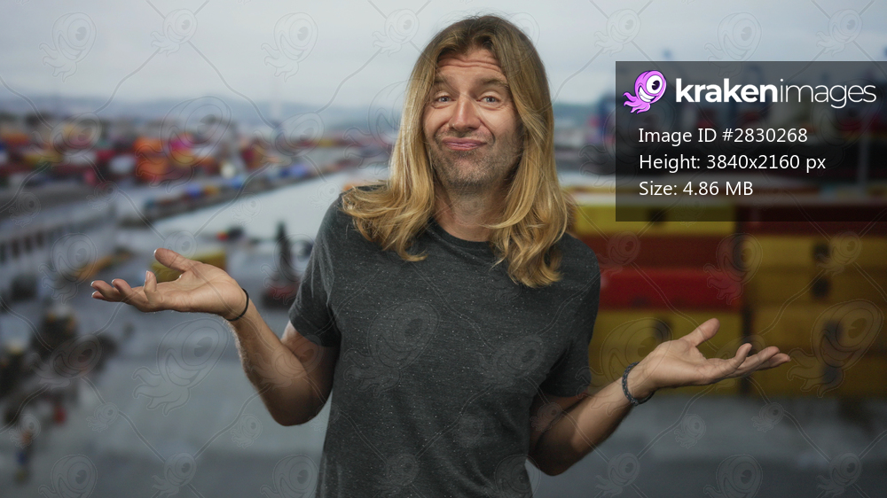 Blond man with long hair shrugs shoulders by stacked shipping containers and moored boats at busy port terminal; uncertainty.