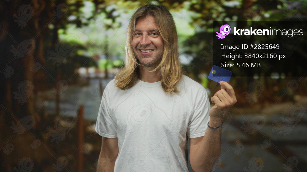 Blond man with long hair smiles and holds creditcard between fingers in sunlit green park; confidence.