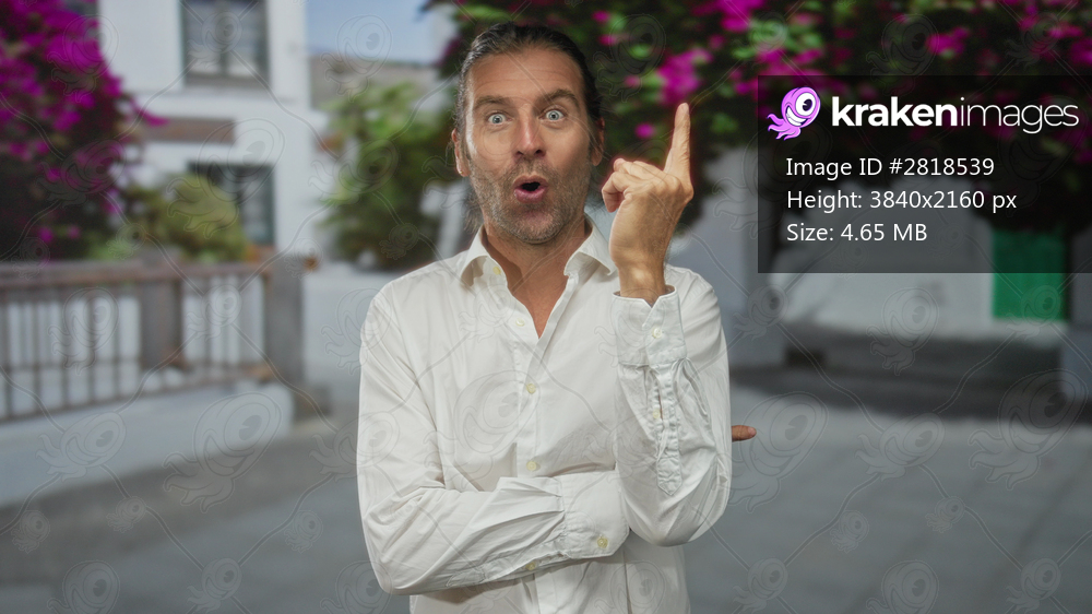 Blond man with long hair stands before vibrant bougainvillea on a sunlit street and points finger upward; idea.