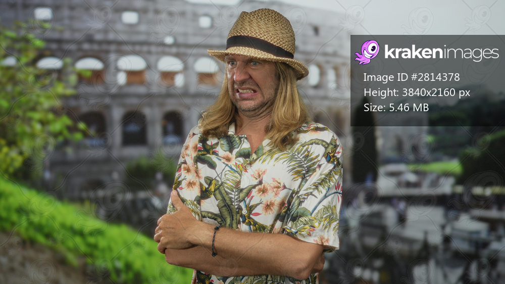 Blond man with long hair and straw hat crosses arms in front of colosseum building grimaces; disgust.