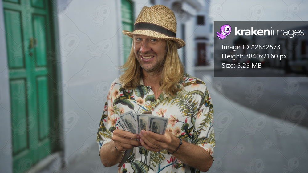 Blond man with long hair and straw hat wearing floral shirt smiling and counting dollars under sunlight on street; happiness.