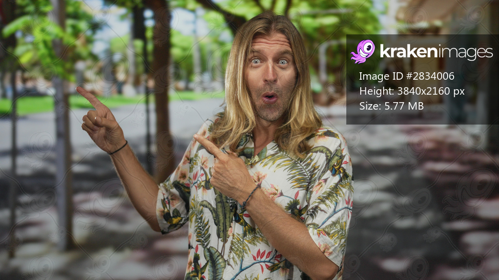 Blond man with long hair wearing a tropical shirt and pointing finger forward along a sunlit leafy street sidewalk; surprise.