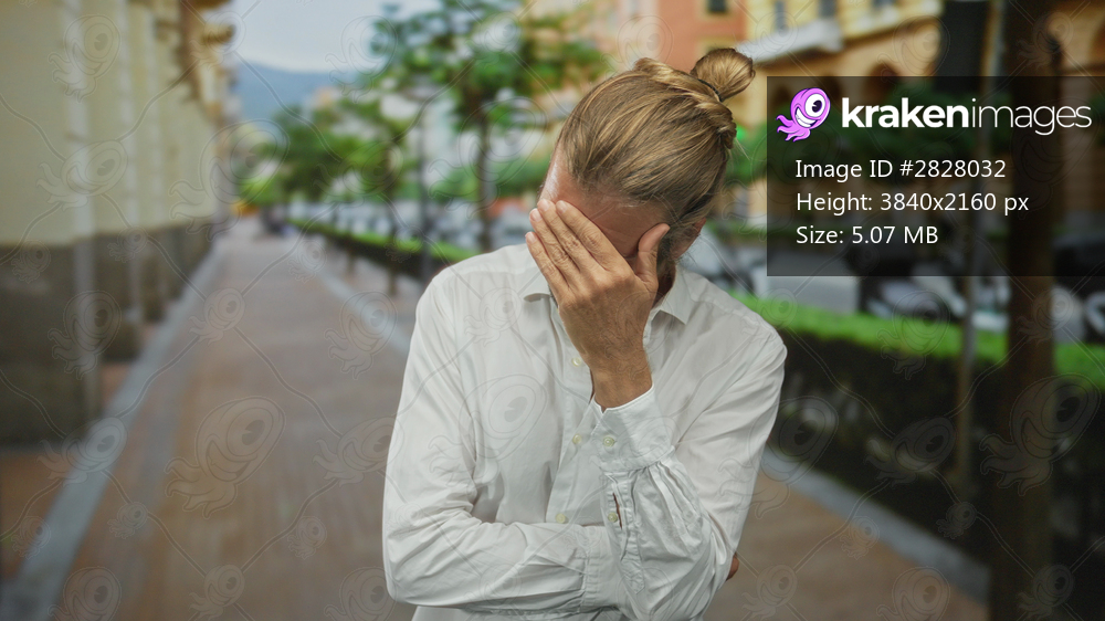 Blond man with long hair wearing a white shirt and hand covering face while standing on a sunlit street; frustration.