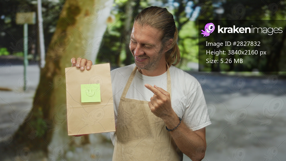 Blond man with long hair wearing apron holds paperbag and points finger to bag in street with smiling face; everyday snack joy.