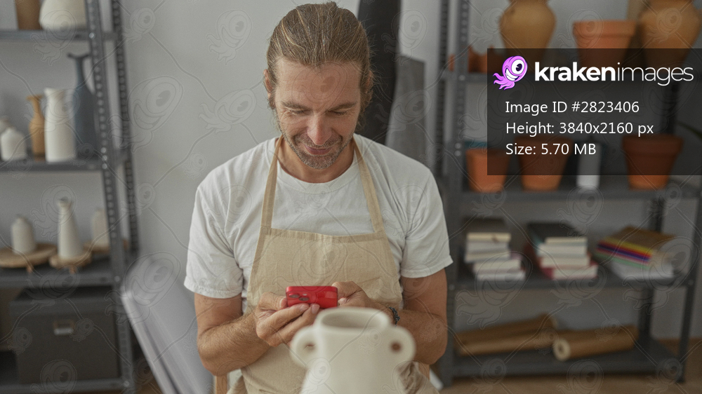 Blond man with long hair wearing apron holds red smartphone while looking down in studio; concentration.