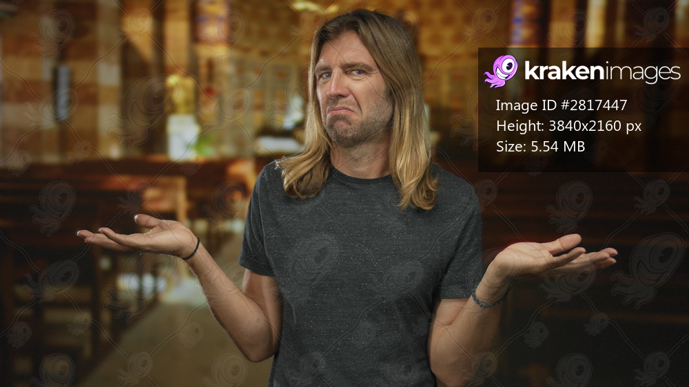 Blond man with long hair wearing grey t shirt holds fingers in air quotes in church building; sarcasm.