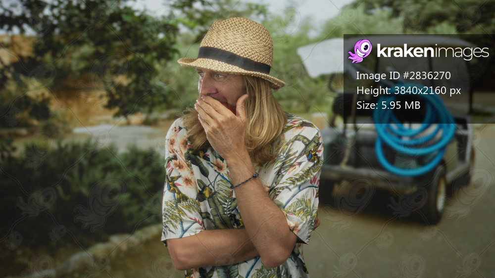 Blond man with longhair wearing floral shirt covering mouth with hand beside golfcart on street; surprise.