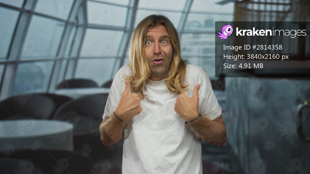 Blond man with shoulder length hair wearing white tshirt pointing finger to chest in building; self confidence.