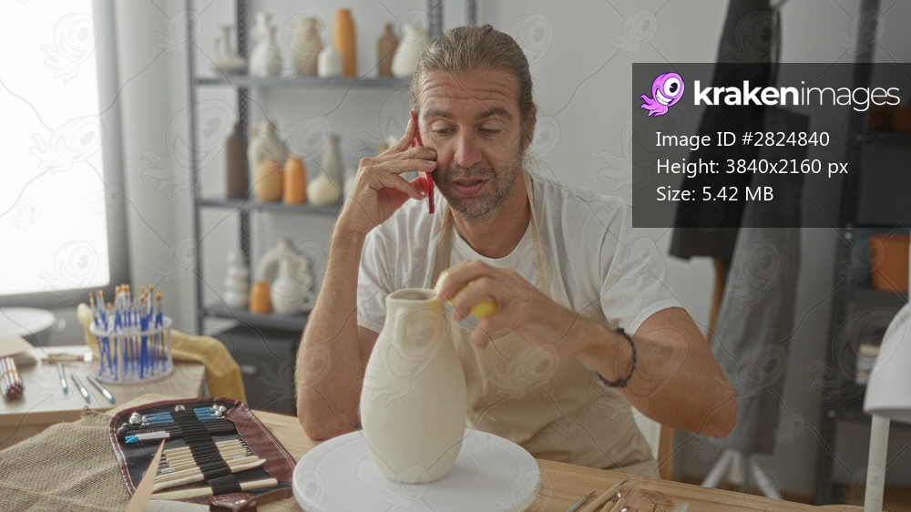 Blond man sponges ceramic vase with sponge and holds phone to ear in studio; craftsmanship concentration.