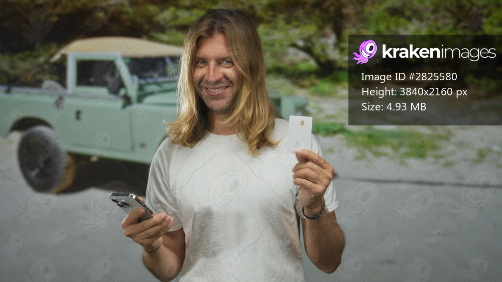 Blond man stands by green offroad vehicle, holds smartphone and card and pouts lips in forest; playfulness.