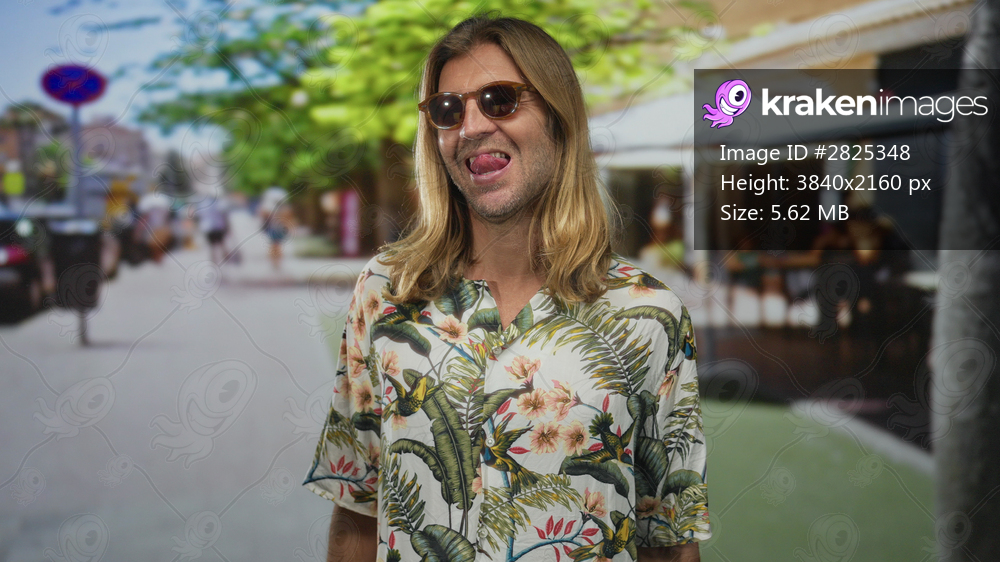 Blond man wearing a floral shirt and round sunglasses smiling casually on a sunny street; holiday bliss.