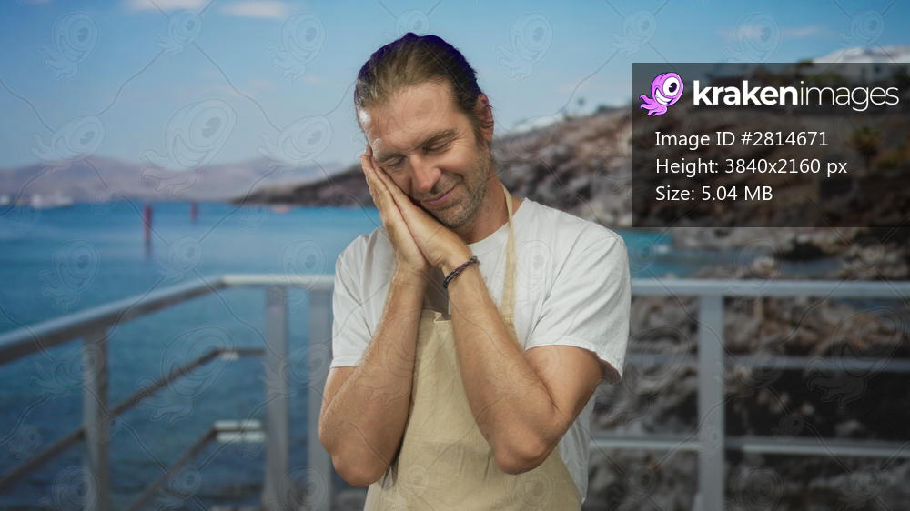 Blond man wearing apron presses hands to cheek on seaside promenade overlooking rocky coastline and blue water; serenity.