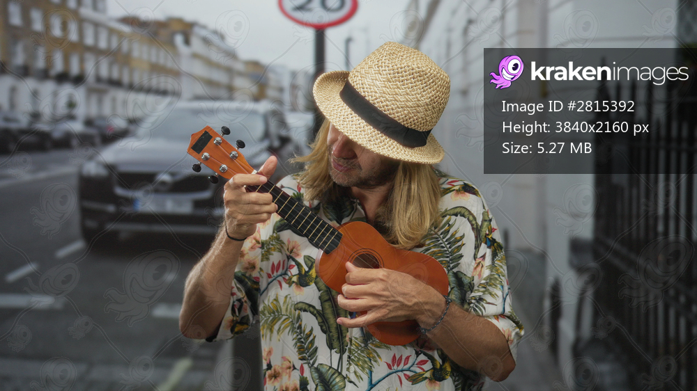 Blond man wearing straw hat and floral shirt strums a ukulele while standing on a narrow street; wanderlust relaxation vacation serenity.