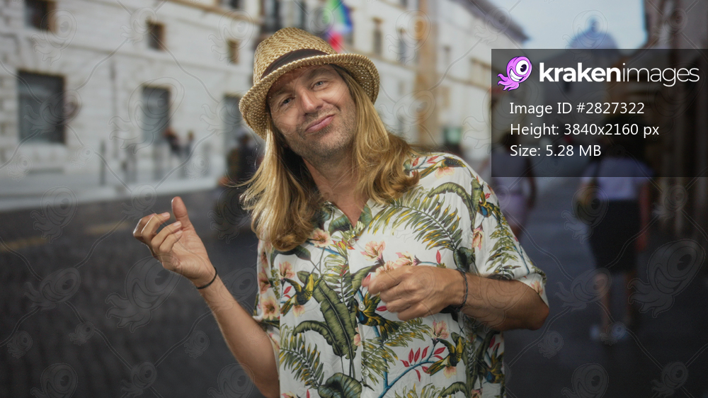 Blond man wearing straw hat strums air guitar gesture on a sunlit cobblestone street; carefree travel.