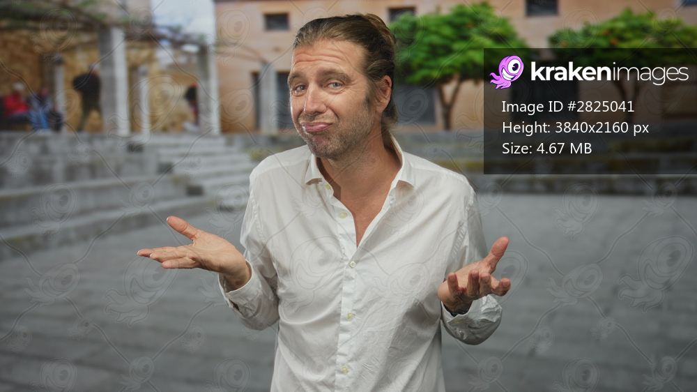 Blond man wearing white shirt scratches neck on sunlit stone steps of urban plaza beside historic building; confusion.