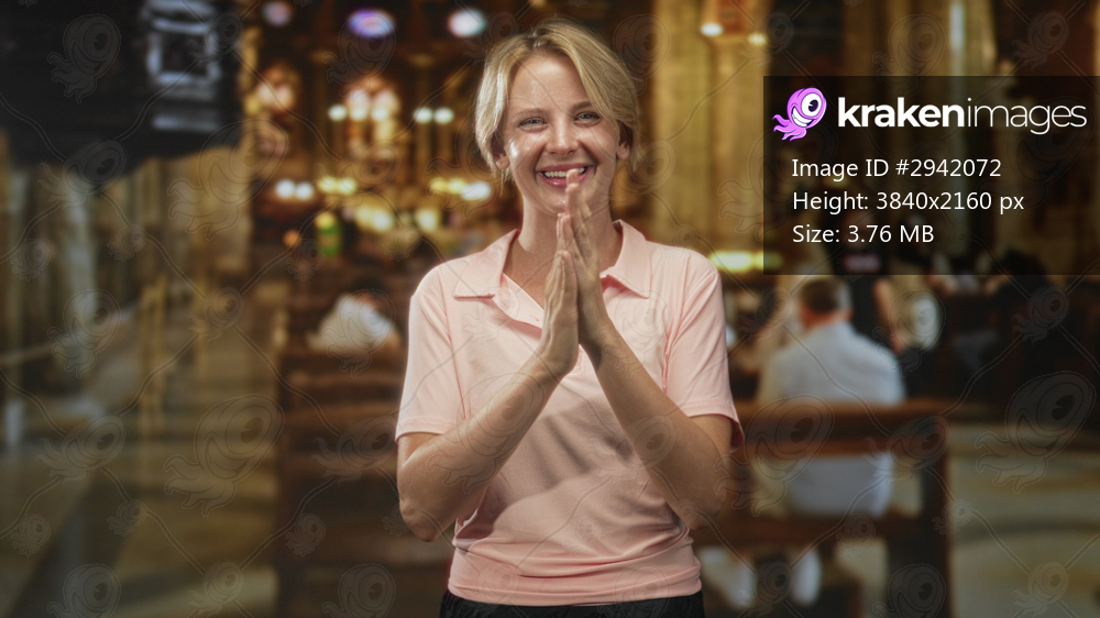 Blond woman claps hands and presses palms together in a churchlike building interior with wooden pews and warm lights; joy gratitude.