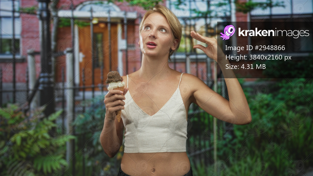 Blond woman holding a double scoop ice cream cone and gesturing palm up while standing before a brick building and iron fence; curiosity leisure summer. - Kraken Images
