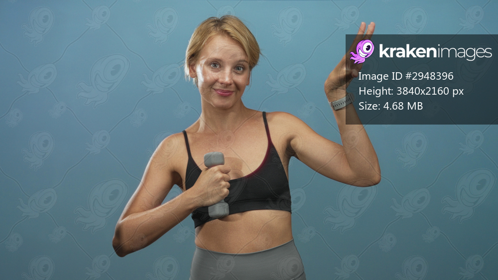 Blond woman holding grey dumbbell at chest, pinching fingers near face, wearing black sports bra and smartwatch in studio; confidence strength wellness. - Kraken Images