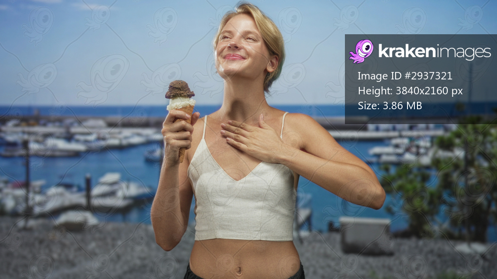 Blond woman holding ice cream cone, hand on chest, smiling at sunlight on street by marina pier and boats; summer bliss.