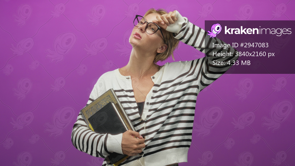 Blond woman holding notebooks and framed book, hand to forehead with glasses against purple backdrop in studio; tired study stress.