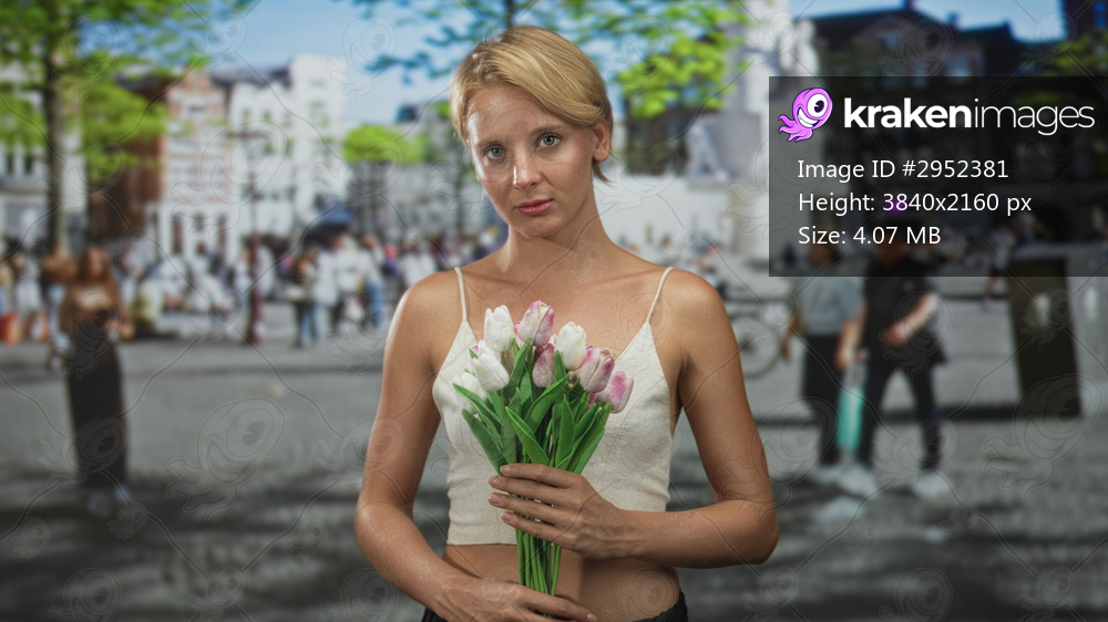 Blond woman holds bouquet of pink and white tulips with bare hands at chest on street plaza in front of city buildings; contemplation.