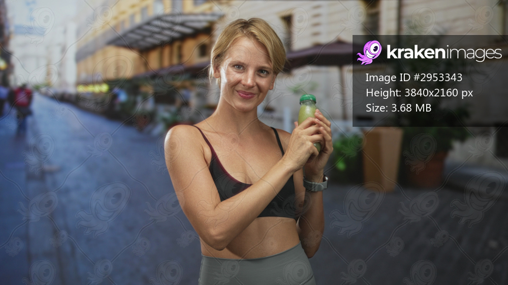 Blond woman holds green juice bottle, points finger to bottle and shakes it while smiling on a street cafe; wellness boost.