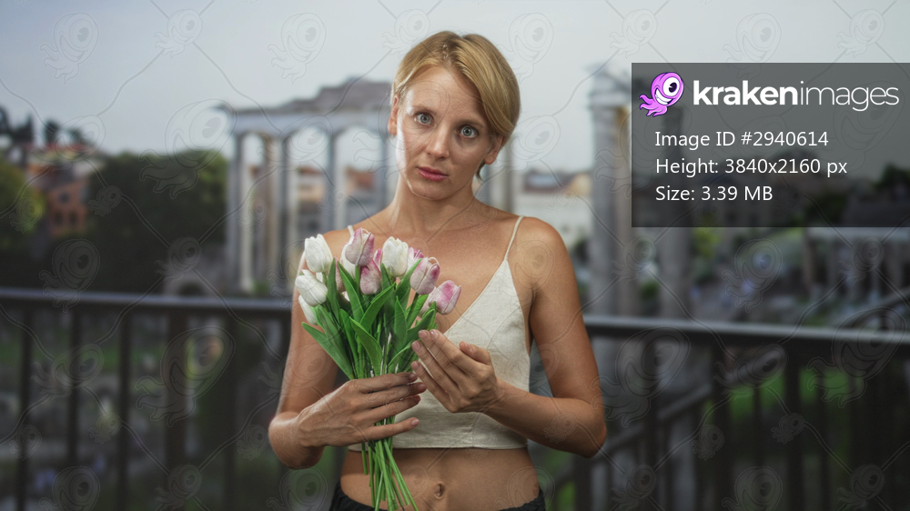Blond woman holds tulips to chest with exposed midriff on building balcony overlooking ancient ruins and cityscape; quiet serenity.