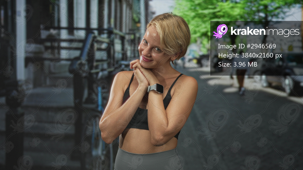 Blond woman in black sports bra with smartwatch, hands clasped near chin on city street, smiling with closed eyes; serenity gratitude.
