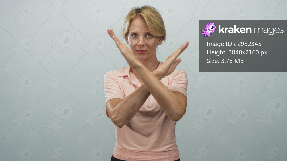 Blond woman in pink polo crosses forearms, hands forming an x over chest while gazing at camera in studio with plain backdrop; defiance.