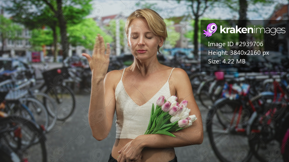 Blond woman in white crop top holding pink and white tulips raises hand to face with eyes closed on bike filled street; quiet reflection serenity.